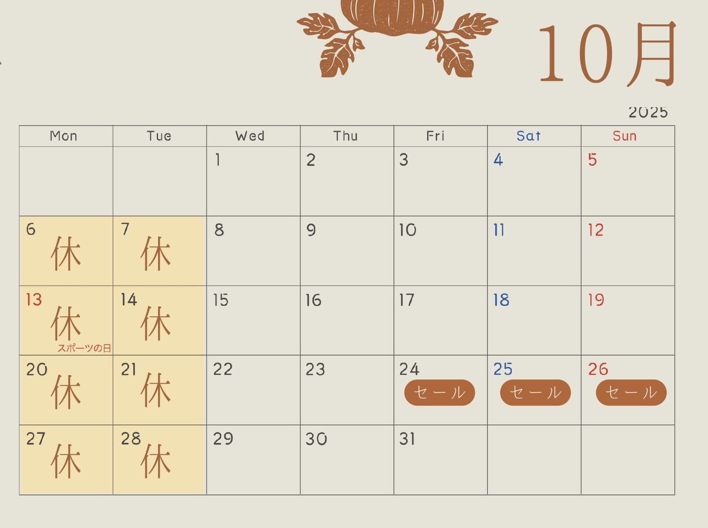 10月度カレンダー