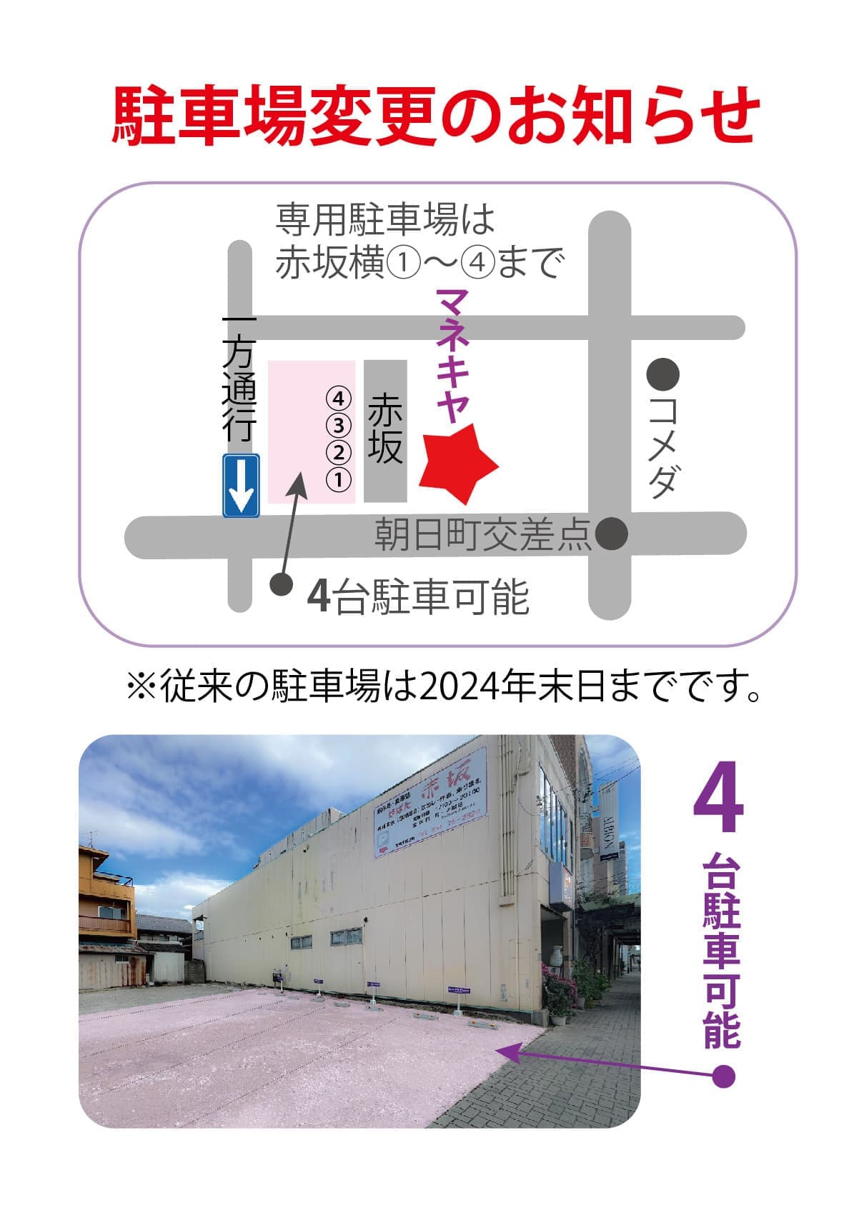 旧赤坂隣に4台分駐車場がありますのでご利用下さい。